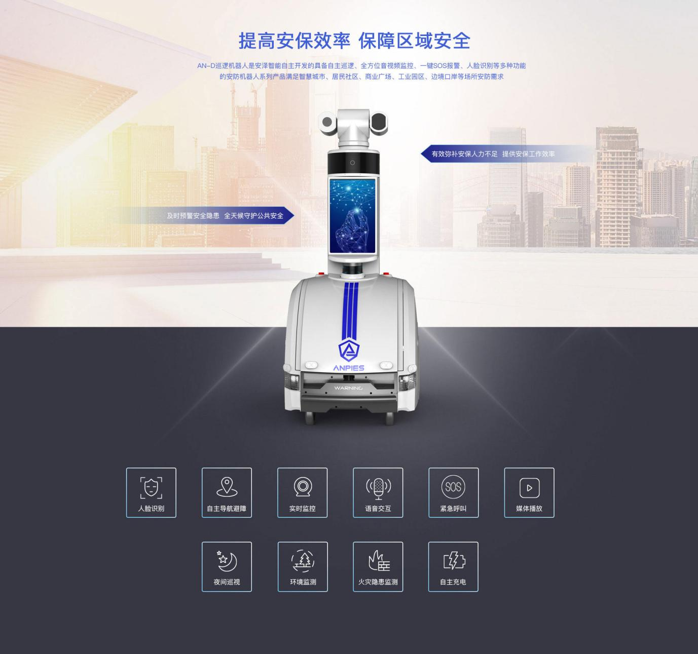 安防巡邏機(jī)器(qì)人(rén)具備自(zì)主巡邏,自(zì)動避障、定點語音(yīn)播報(bào)、人β(rén)臉識别、全方位視(shì)頻(pín)監控,一(yī)鍵SOS報(bào)警、人(rén)臉識别、環境監測、語音(y'īn)對(duì)講等多(duō)種功能(néng)的(de)安防機(jī)器(qì)人(rén)系列産品滿足智慧城(chéng)市<(shì)、居民(mín)社區(qū)、商業(yè)廣場(chǎng)、工(gōng)業(yè)園區(qū)、邊境口岸等場(chǎng)所安防需求。 (1)24小(xiǎo)時(shí↑)移動執勤:可(kě)在重點區(qū)域自(zì)主巡邏、定點執勤,突破傳統安防被動監控、監控點固定等問(wèn)題,為(wèi)事(shì)件(jiàn)處置提供依據,提高(gāo)社會(h≈uì)見(jiàn)警率,提升民(mín)衆安全感 (2)實時(shí)全景視(shì)頻(pín)監控:360°環視(shì€)相(xiàng)機(jī)與可(kě)見(jiàn)光(guāng)夜視(shì)雲台,24小(xiǎo)時(shí)全景視(shì)頻(pín)監控,視(shì)頻(pín)→數(shù)據傳輸至後台,可(kě)實時(shí)分(fēn)析與檢測,及時(shí)預警潛在危險 (3)機(jī)動快(kuài)速的(d↑e)移動布控:針對(duì)重大(dà)安保活動突發性、快(kuài)速性、移動性特點,基于4G/5G通(tōng)訊和(hé)指₩揮平台,可(kě)實現(xiàn)靈活部署、快(kuài)速布控,遠(yuǎn)程執法