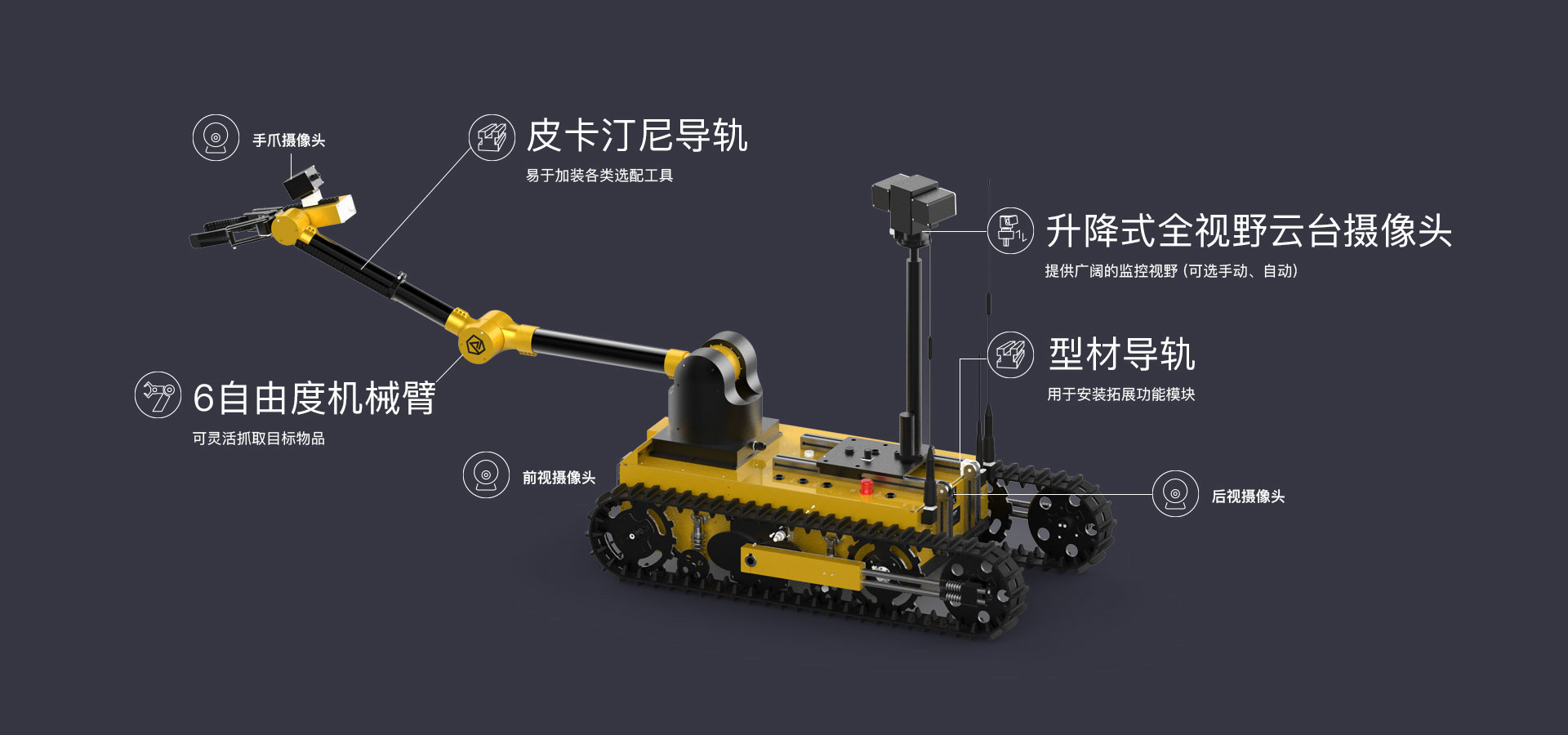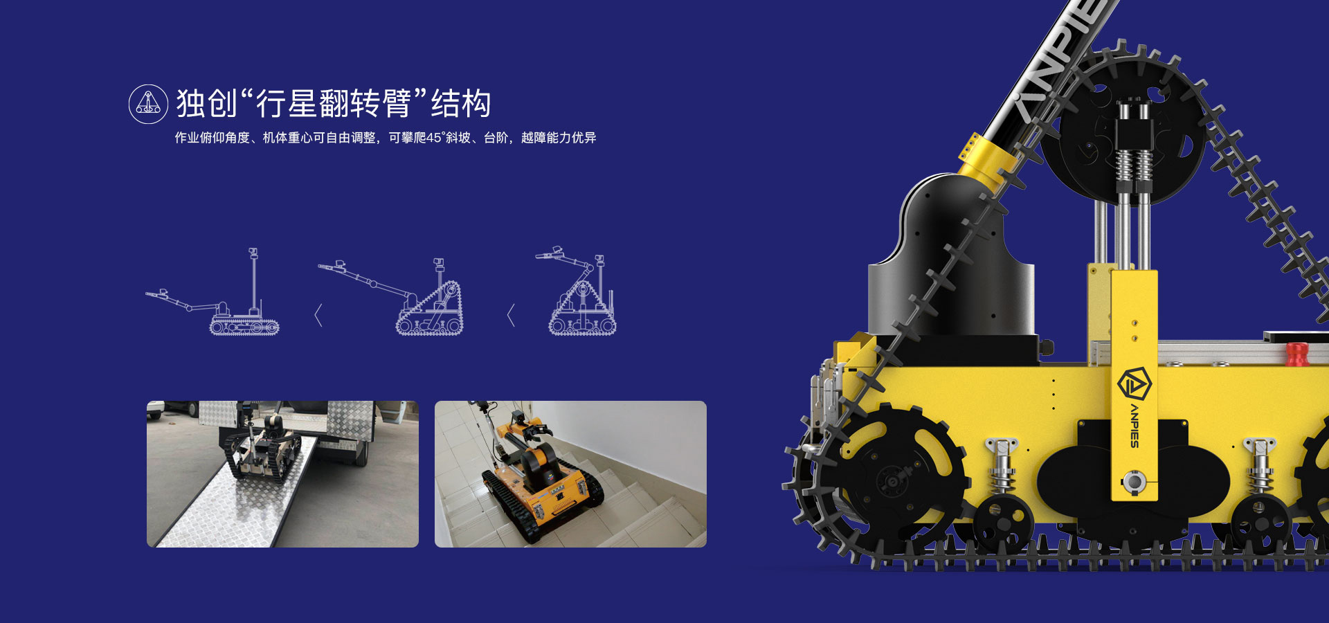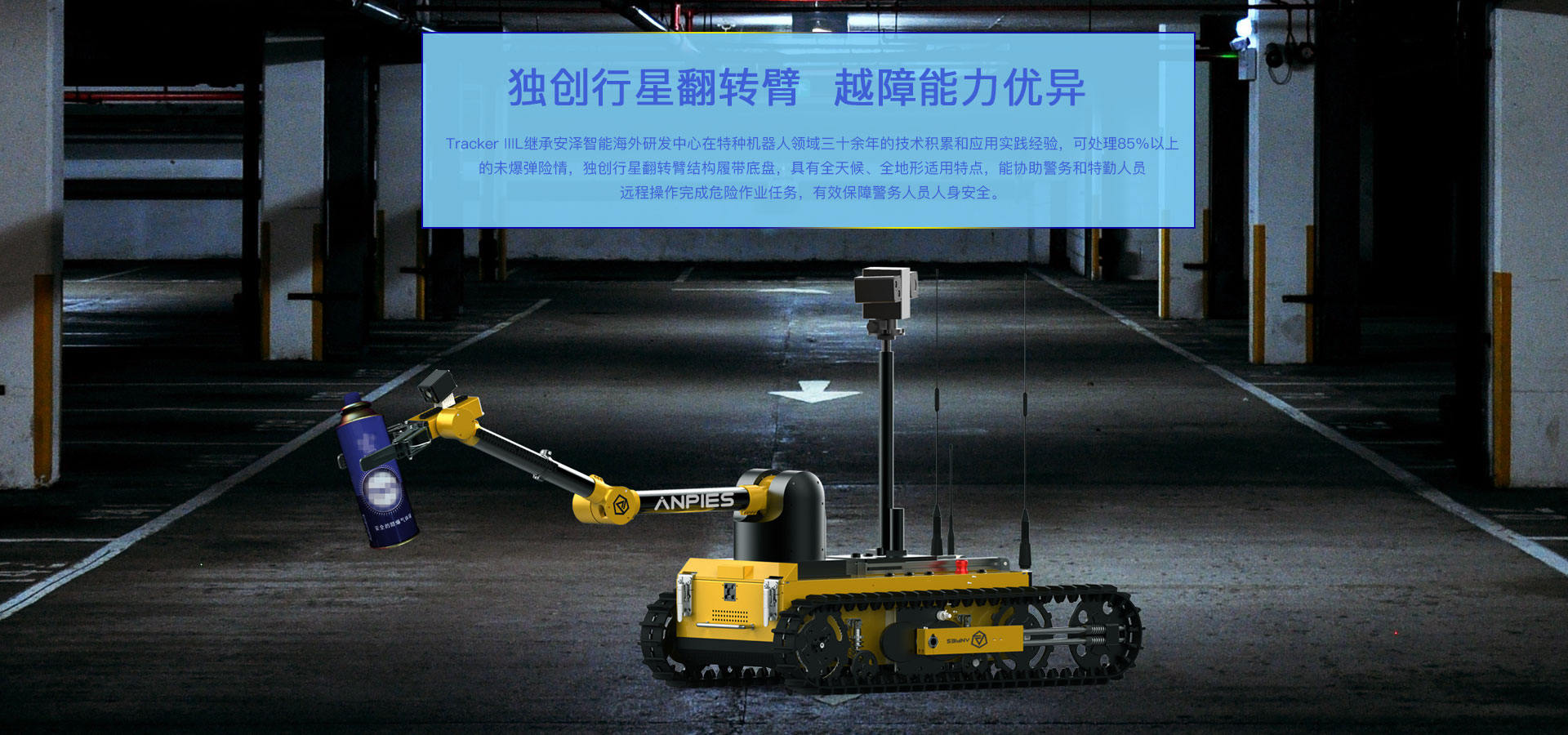 主要(yào)用(yòng)于危險物(wù)品抓取、轉移、銷毀等作(zuò)業(yè),完成排爆除險、特警防爆、危險品處置等用(yòng)λ途的(de)專用(yòng)移動機(jī)器(qì)人(rén)産品,可(kě)以完成危險性高(gāo)、随機(jī)性大(dà)<、現(xiàn)場(chǎng)情況複雜(zá)多(duō)變的(de)任務,協助警務和(hé)特勤人(rén)員(yuán)遠(yuǎn)程操作(zuò)完成危險作(zuò)業(yè)任£務,有(yǒu)效保障警務人(rén)員(yuán)人(rén)身(shēn)安全。采用(yòng)獨創行(xíng)星翻轉臂結構履帶式底盤,可(kě)自(zì)由改變機(jī)體(tǐ)作(zuò)業(yè)的(de)角度及重心,能(néng)夠攀爬樓梯、跨越溝渠,可(kě)适應沙地(dì)、瓦礫、草(cǎo)地(dì)等 多(duō)種複雜(zá)地(dì)形。